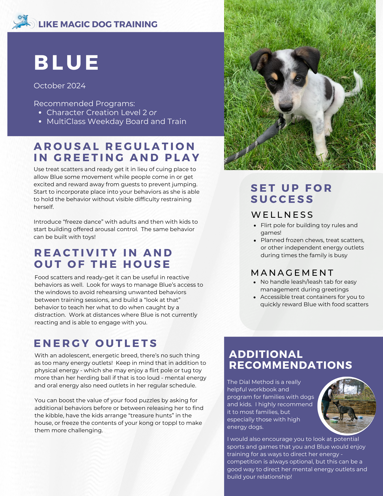In terms of next steps, you both expressed that you prefer to stay involved in learning throughout the process, and that a package that would allow for this would be the most useful for you. We have a good number of behaviors to address, so I would recommend either a Character Creation Level 2 ($1240) or a MultiClass ($3500) program for Blue. Both of these programs are structured to keep owners involved as behaviors develop. Obviously outside of cost differential, the primary factor that I would be looking at is reasonably the amount of time you have available to work the “homework” between private training sessions - factoring in colder weather, less daylight, and upcoming holidays. Character Creation is going to by its nature have more of the behavior building work done by you, where MultiClass focuses more on practice on the weekends after Blue has worked the behaviors over the course of the week. Let me know what you’re thinking and if either of these programs would fit well!