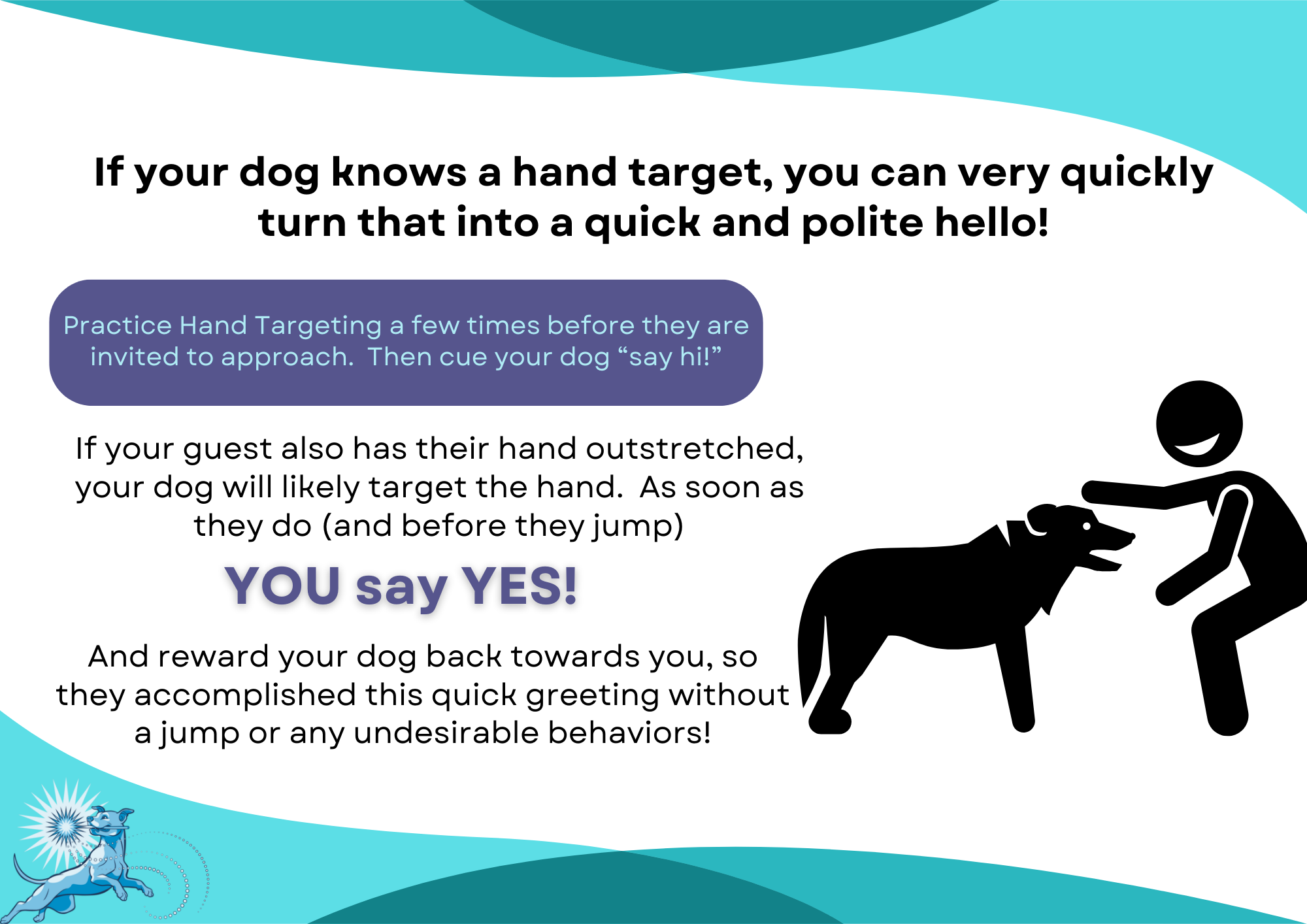 Over time, you’ll lengthen his time spent on his place and reduce the need first for treat scatters and then ideally for the staggered approach, so he can be released from his place to come over and sit for greeting. Make sure you are gauging his success at each of these stages though, and not progressing until he’s ready. Jumping, barking, and nipping can all be significantly reinforcing behaviors for Blue, so it’s all the more important that he has limited chances to practice those undesirable behaviors as he’s learning better ones!