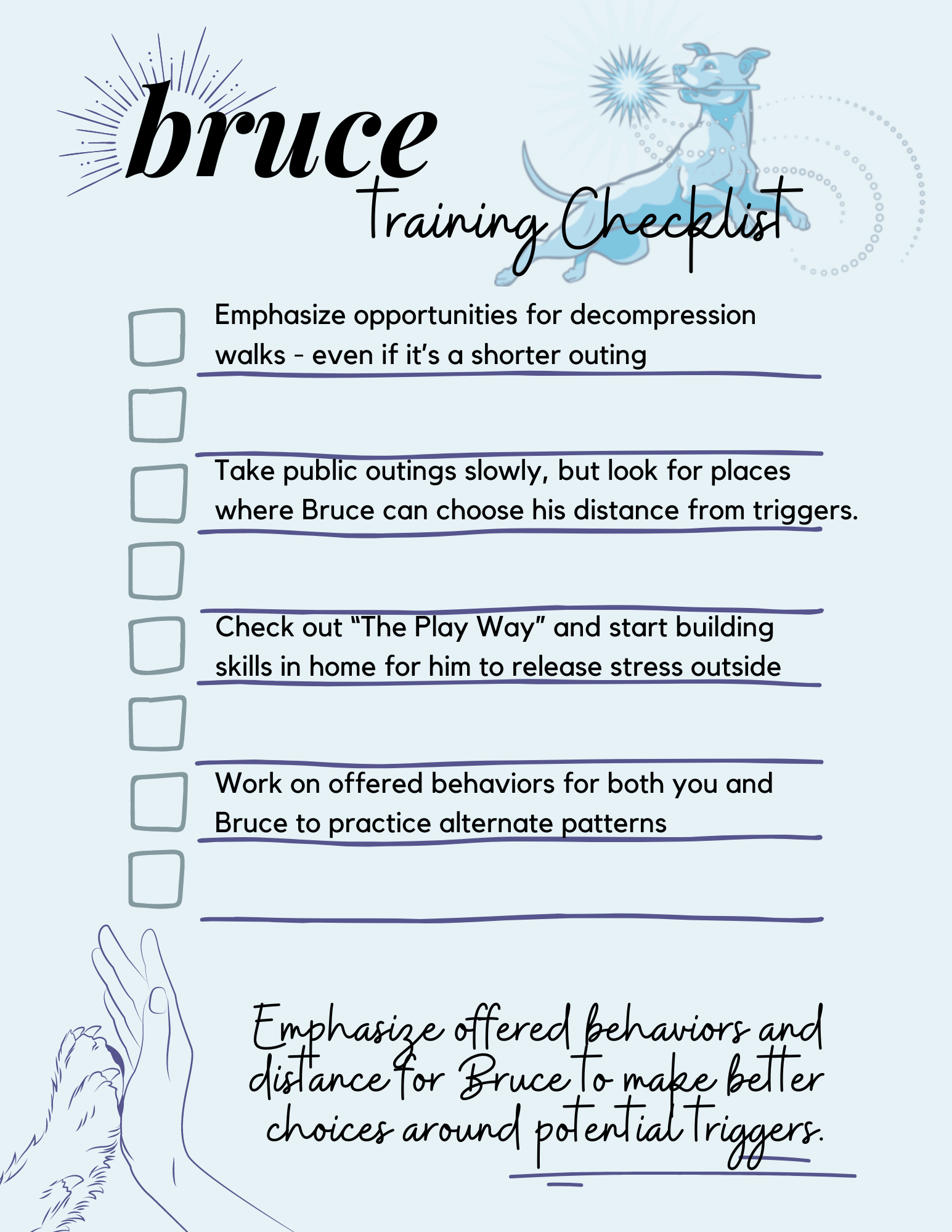 Thanks again for all your dedication to Bruce’s training—I’m here whenever you need support moving forward!