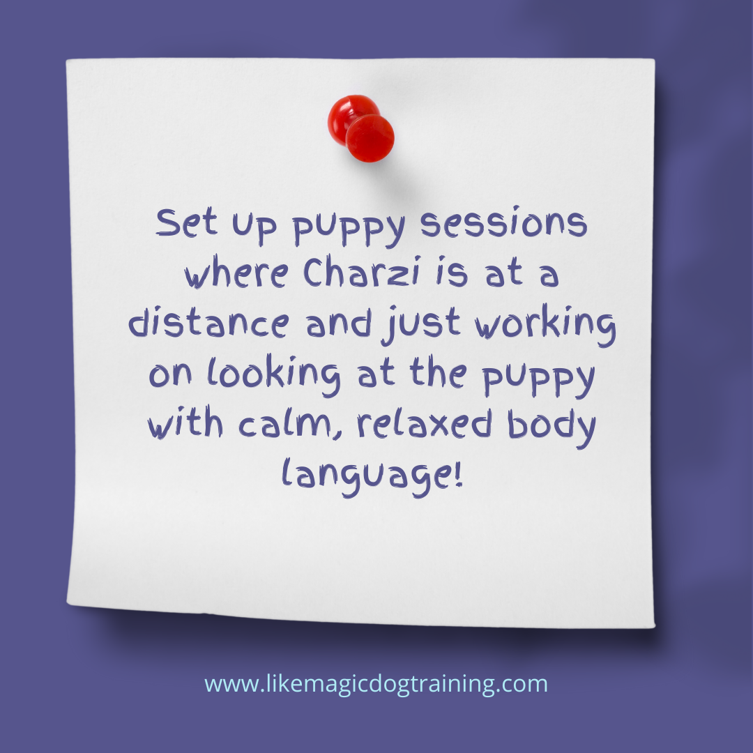 Use a similar set up for puppy integration now to what we did with Charzi and Fig today. Start at a distance with Charzi already happy and engaged with handling. Have puppy brought out on a leash far away and have puppy still (use a treat scatter or food toy to help puppy stay still) while Charzi moves back and forth at a distance parallel to the puppy. Once Charzi is comfortable, puppy can move parallel back and forth as well. Let me know how that’s going and we can talk next steps!