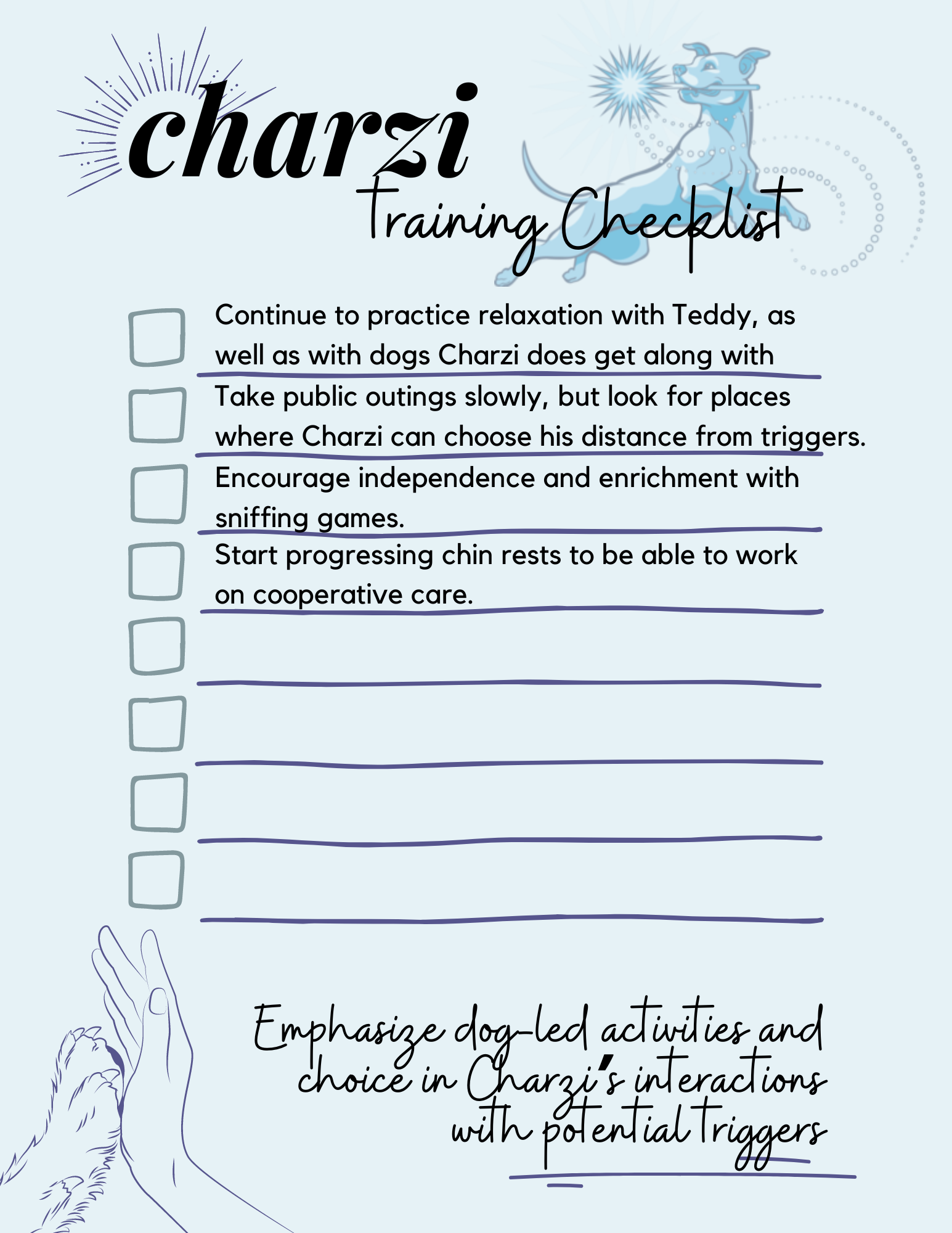 Emphasis on learning early warning signs of Charzi’s discomfort - the “Learning to Speak Dog” lesson in Module 1 will go into more detail on individual details to look for, but focus on where Charzi tenses, chooses to move away, or leans forward or away from stimuli. Whether he will or will not take food is a big tell! Games that emphasize movement for him seem to help him not get caught up, so consider even “look at that” games might be improved by including some movement away from a trigger.