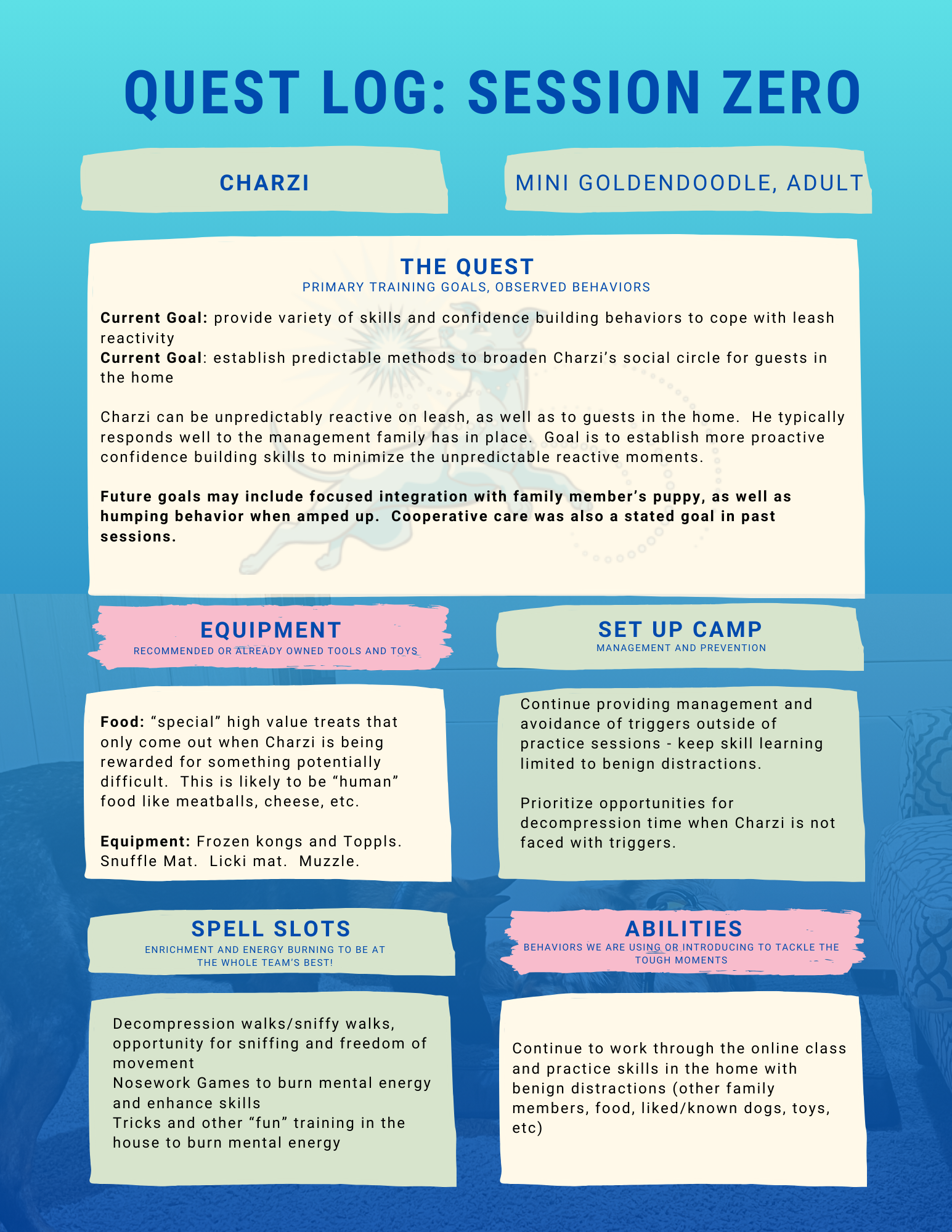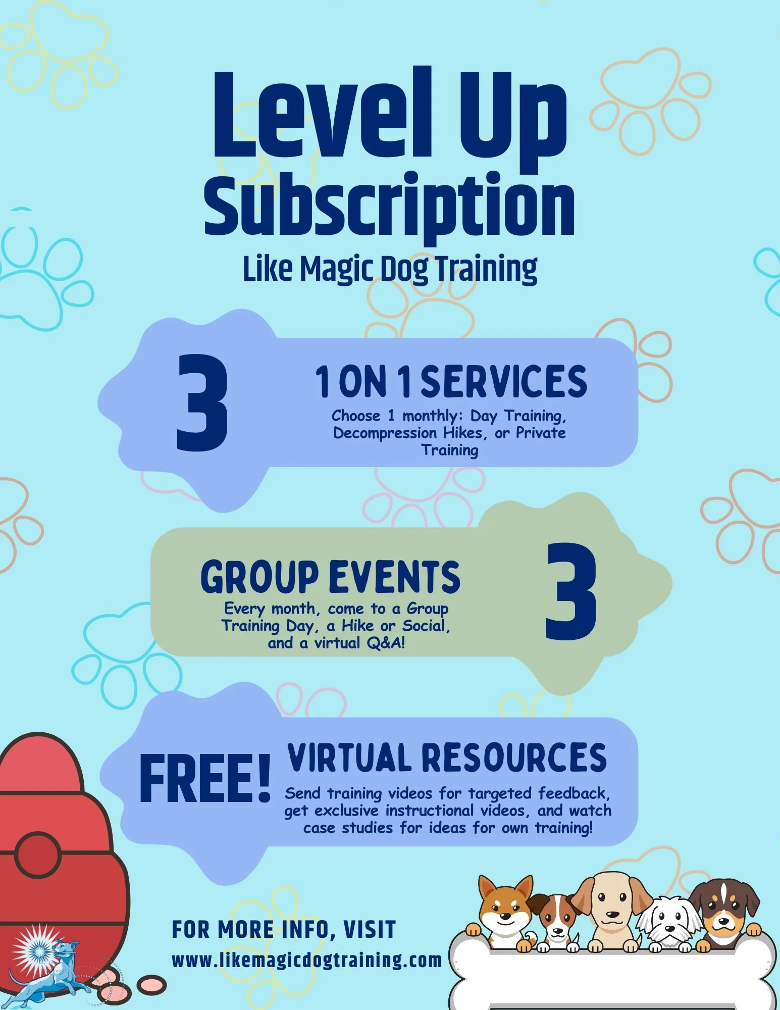 Future sessions beyond that are a little dependent on what your next steps look like in terms of priorities. I do think that the Level Up subscription would be a nice maintenance phase for Charzi - the monthly subscription includes either a decompression hike, a private training, or a day training monthly, as well as “office hours” virtual coaching, group decompression hike or play, and a “club training day” monthly. If we’re not quite at maintenance, I would lean towards more private sessions specifically to build his and your skill set.