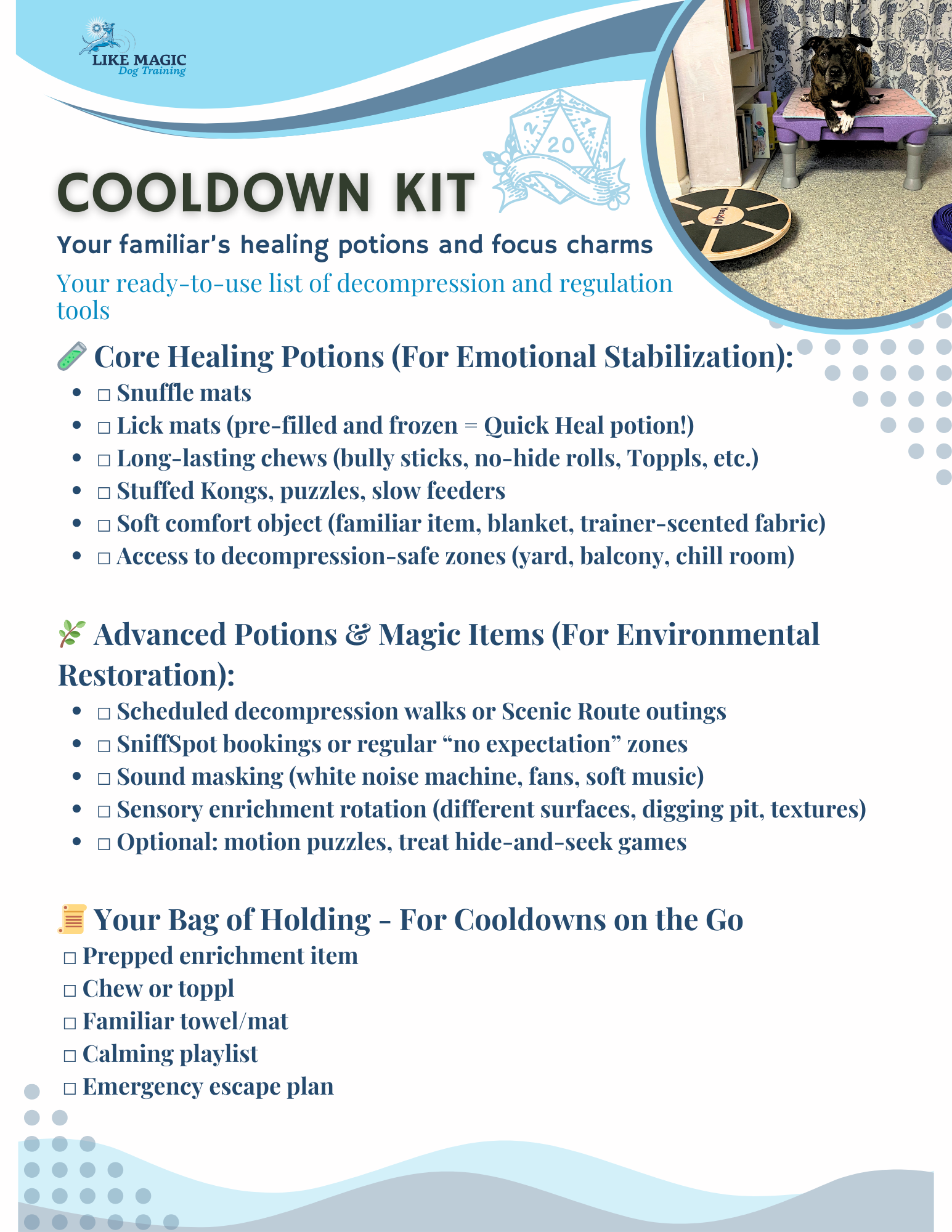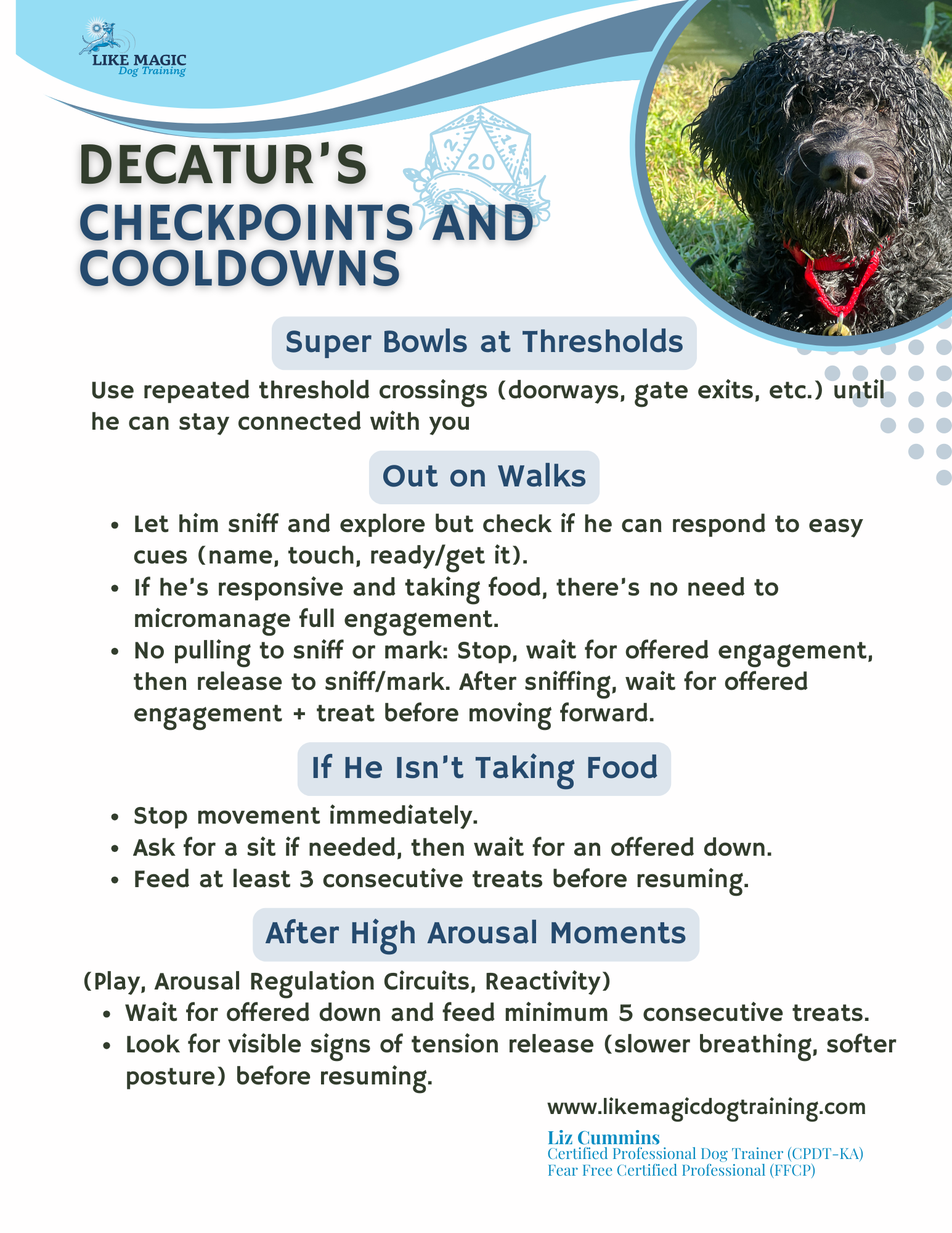 From the very beginning, Decatur showed me that he’s a bright, active, and highly sensory-seeking dog. He is curious about everything and wants to experience the world fully — which can sometimes push him over the edge into hyperarousal. His work here focused on helping him develop skills to regulate himself in those moments so he can use that wonderful brain of his to make better choices.