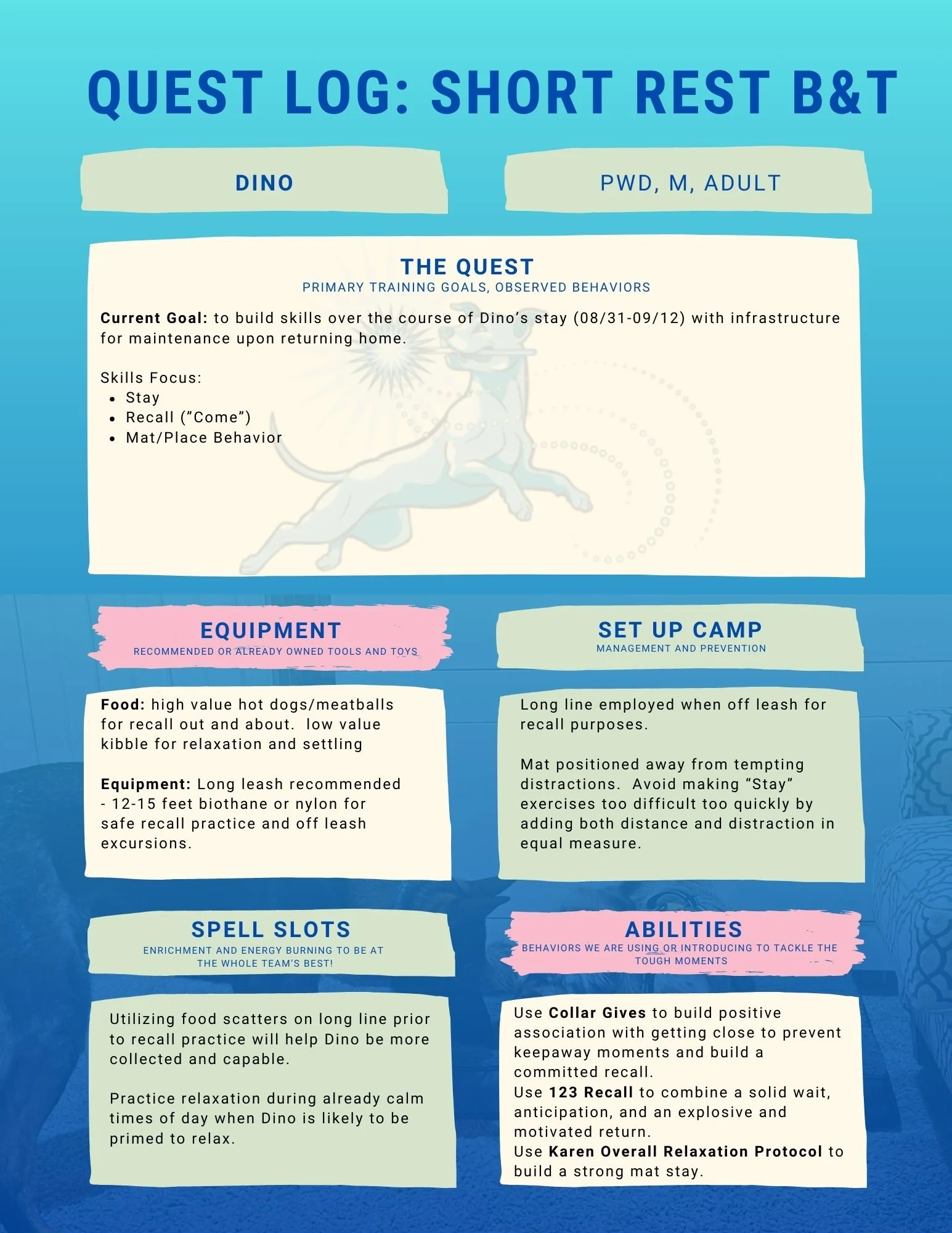 I would recommend continuing with the Overall Relaxation Protocol that we started. Dino has done sessions through Day 5 with a few repeats, but there are 15 days of slowly building distraction, distance, and duration with a really solid stay.