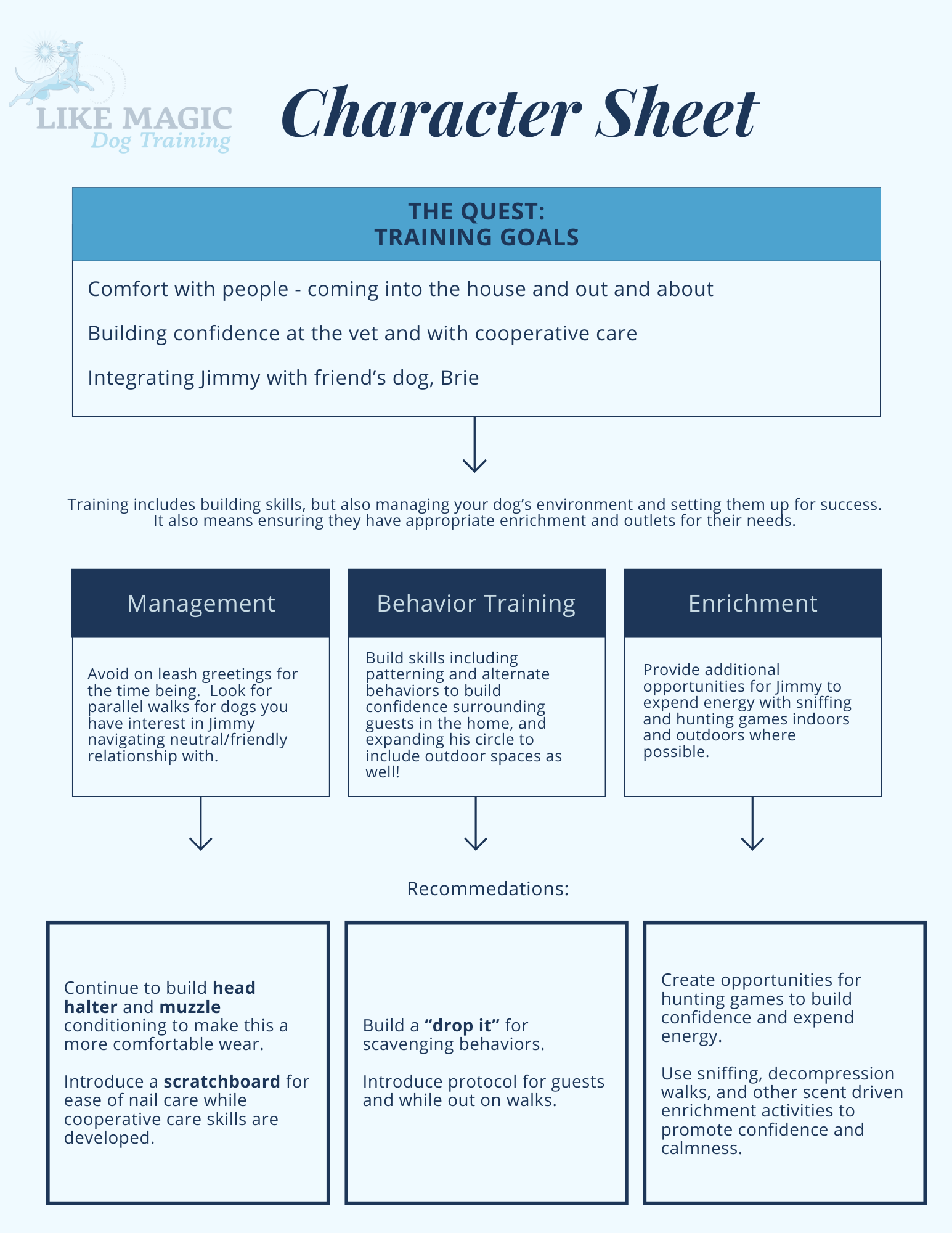 I would love to continue working with you both and with Jimmy. As we discussed, it sounds like we have a pretty solid roadmap towards broadening his world in the house, but I’m completely open to helping that along at any step or time that you need. I also would be happy to work through cooperative care goals or other manners behaviors now that you do have a plan moving forward for him. Let me know what you’d like to work on next and we can figure out a plan that would best suit your needs!