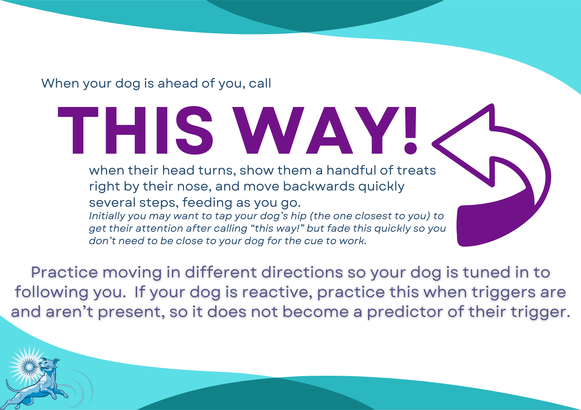 Start by rewarding your dog for moving behind your back, progressing with the treat until they are comfortably moving directly behind you. Once they’re continually doing that, you can add a treat tossed between your legs, or lured through your legs.