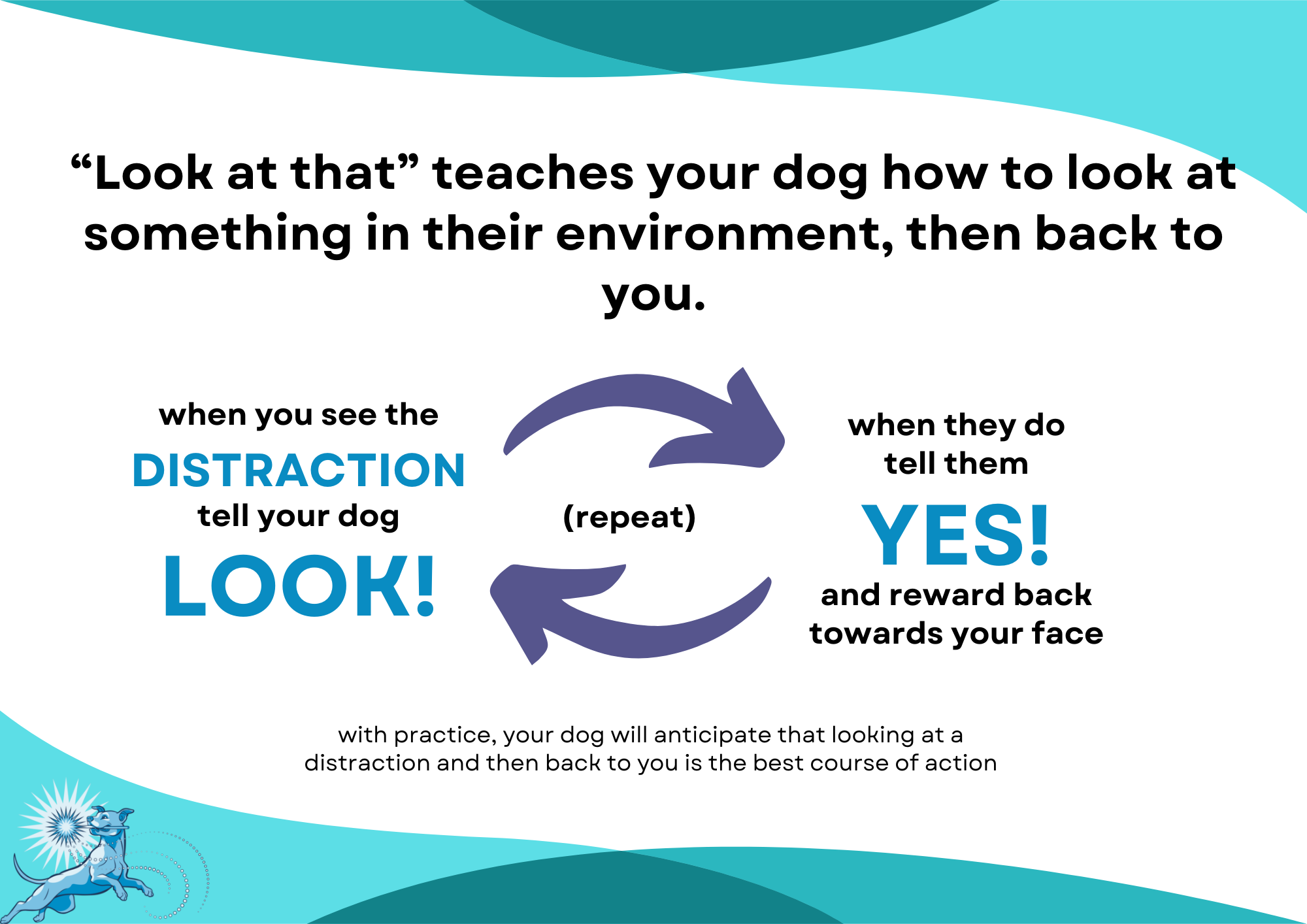 Play Look at That, Ready Get It, and use Treat Scatters to reinforce calm attention.