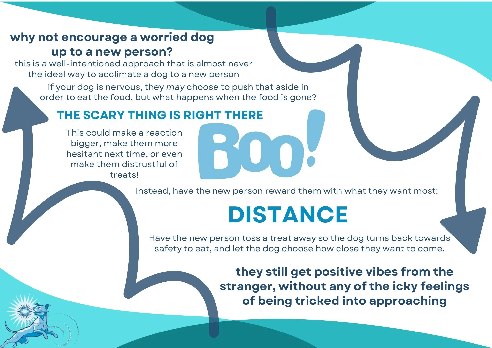 Have guest sit opposite or away from Juno. Any time your guest gets up, moves around, etc., move back into rewarding for “look at that” type behaviors. If he needs to be crated at any point during the visit because he feels uncomfortable, that’s completely fine!
