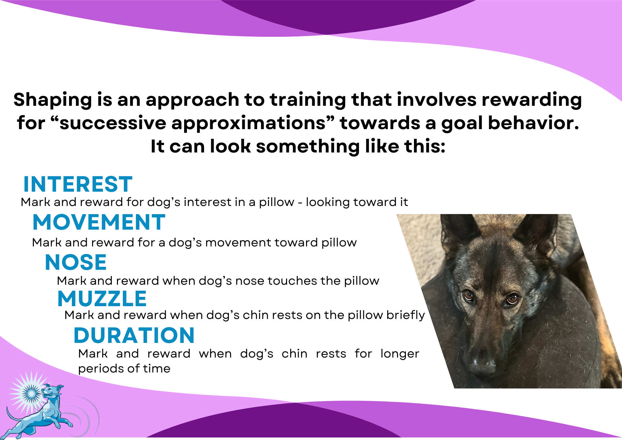 Once he’s successful at this you can start adding small behavior in - I recommend asking for behaviors you can reward above Juno’s head so he isn’t in the habit of dropping his head or pawing the muzzle off - this can be sit, spin, targets, etc. Ask for small, easy behaviors in short duration, then ask for a chin again, unclip the muzzle and release with a “get it!” Keep these muzzle-on sessions short and enjoyable for both of you.