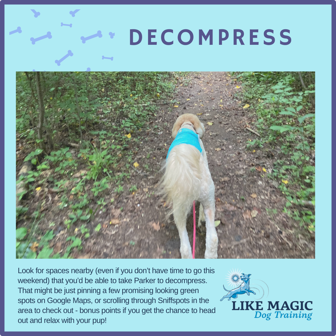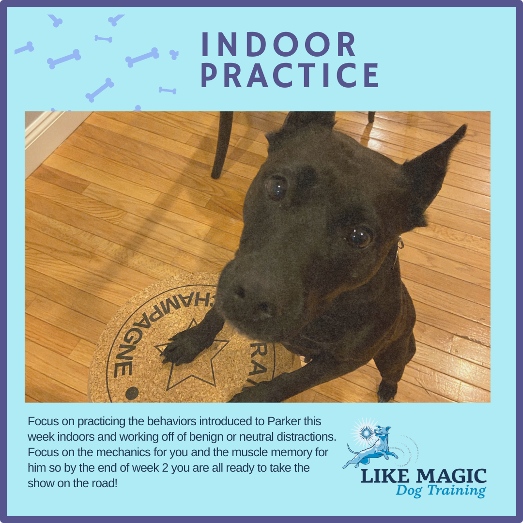 All of these behaviors can be practiced in the house or yard so Parker can start building up muscle memory for this. We spent most of our time this week introducing these behaviors indoors, and only started to bring them outside in the last two days. My recommendation is to always trail a step behind, so for the weekend focus on decompression opportunities and practicing behaviors indoors!