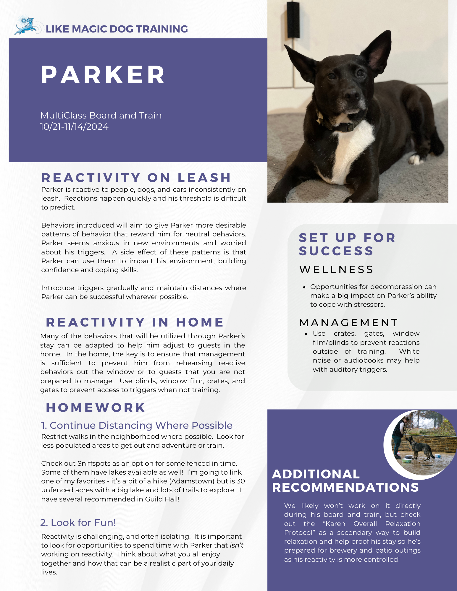 As well as practicing in a variety of new environments. During his handoff we also focused on a protocol for his reactivity on knocking at the door using “Go Sniff” Starting where he is under threshold, have one partner knock on the wall or by the front door. Reward Parker and cue a “Go Sniff” into his snuffle mat. Repeat steadily until you can have the person in and out of the front door, or you can leave Parker to go open the front door. This cue can be translated into a cue for him to go and seek out the snuffle mat away from the door (possibly after one alert bark, rather than a full reactive outburst).