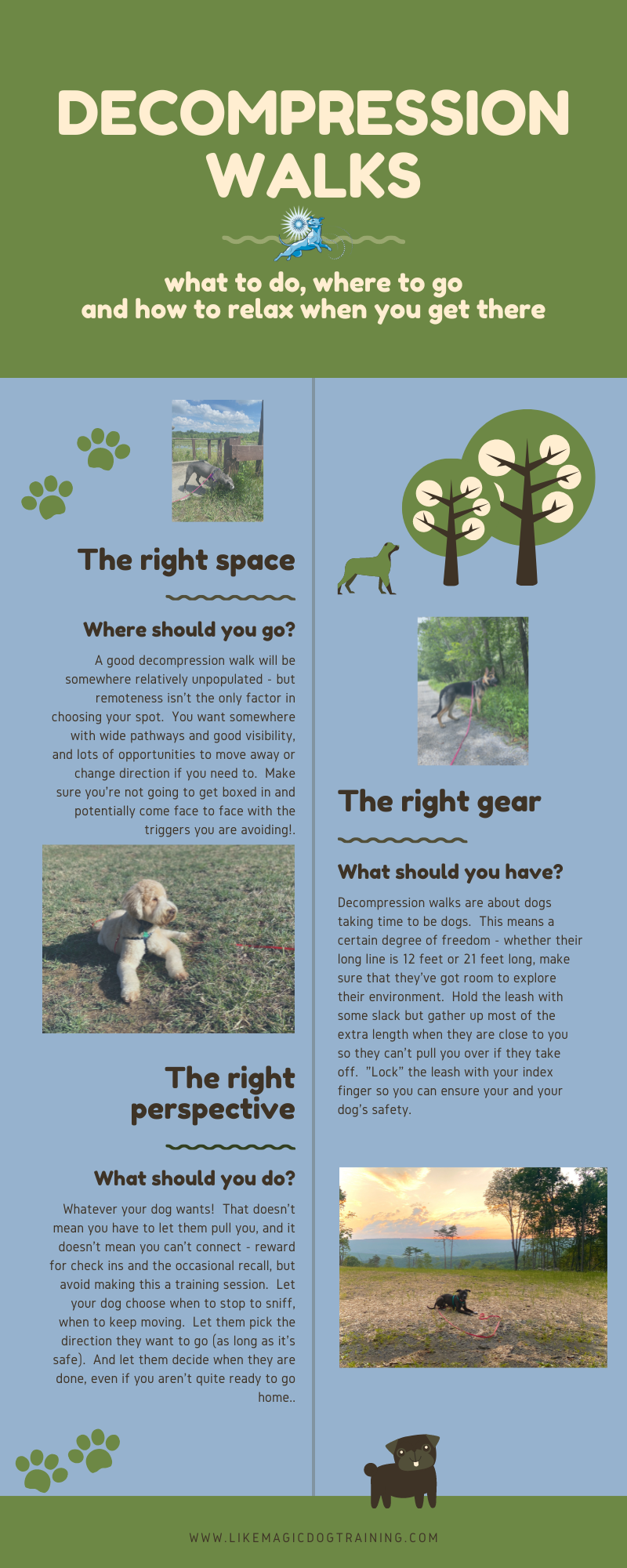 This structure emphasizes physical and mental welfare, and changing behavior by setting up successful interactions with positive reinforcement driving preferred behaviors. I am always cautious before including any behavior in a training plan that may exacerbate frustration or distress for your dog, and will work to avoid creating fallout and mistrust in your training program.