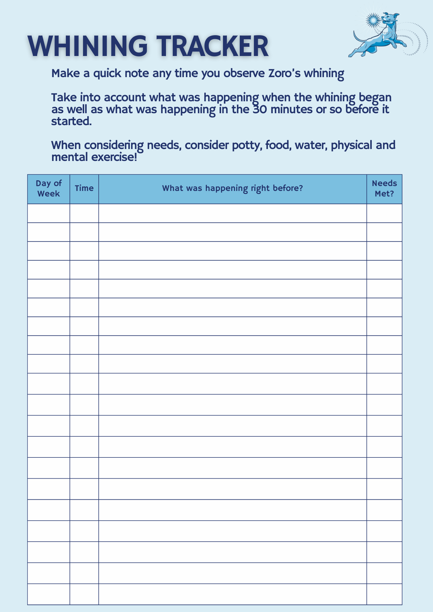With all the rain lately, it makes total sense that outdoor work has been limited. Sounds like Zoro has been doing well indoors, especially around the whining — awesome! Keep using the tracker whenever something stands out, and let me know if we start to see any consistent trends.